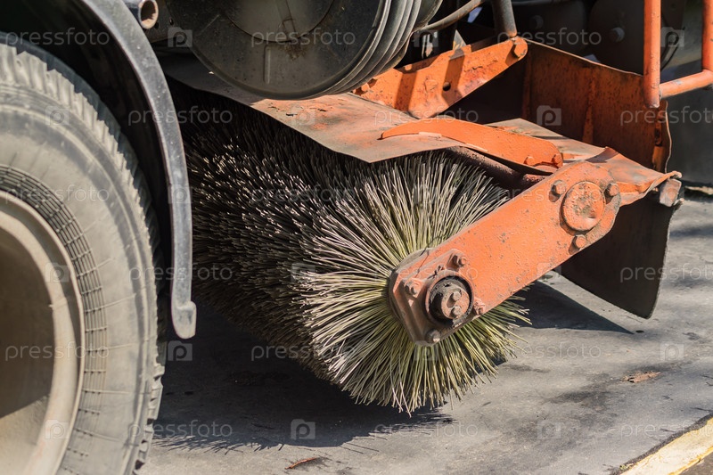 Крупный план подметально-уборочной машины моет асфальтовую дорогу