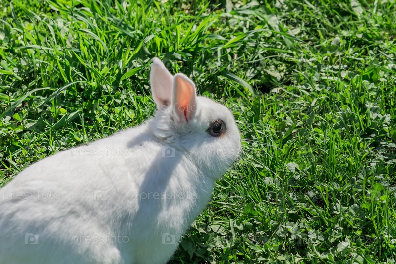 Портрет маленького белого кролика, сидящего в траве
