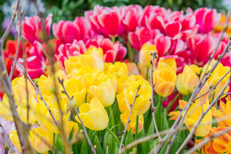 Поле цветущих красочных тюльпанов, весенние цветы в саду