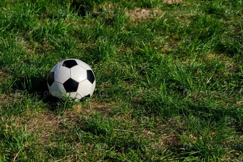 Футбольный или футбольный черно-белый мяч на фоне зеленой травы