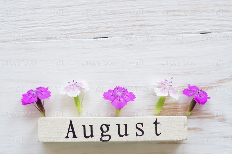 Вид сверху деревянного календаря со знаком августа и розовыми цветами