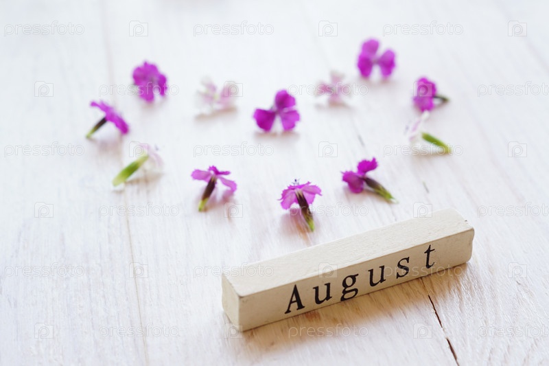 Вид сверху деревянного календаря со знаком августа и розовыми цветами