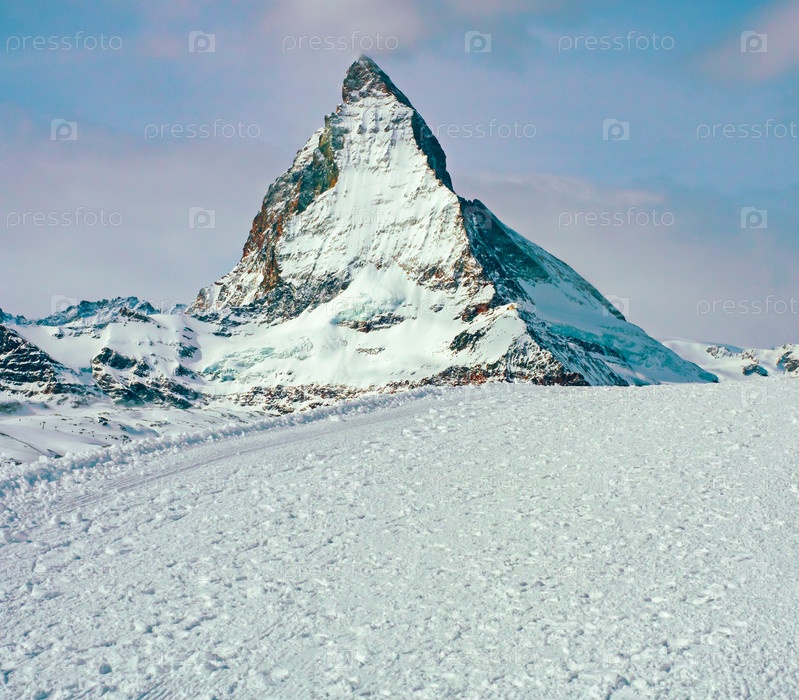 Знаменитая красивая гора Маттерхорн высотой 4478 м. Вид с горы Горнерграт Церматт, Швейцария. отличный дизайн для любых целей. Снежный зимний красивый пейзаж. Светлый фон