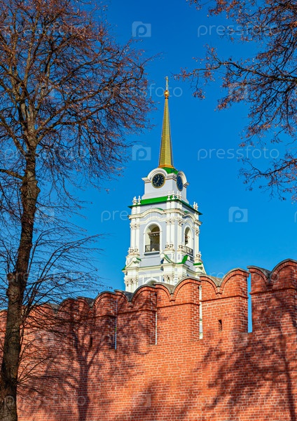 Собор Успения Пресвятой Богородицы за стеной Тульского кремля, Россия. Русская достопримечательность. зимний пейзаж