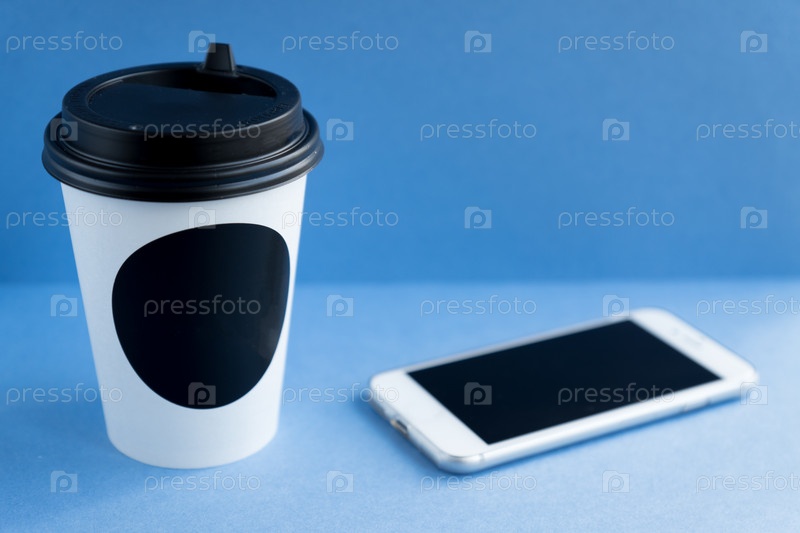 Одноразовая чашка из белой крафт-бумаги для кофе с черной пластиковой крышкой и белым мобильным телефоном на синем фоне