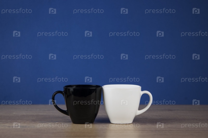 Две чашки черно-белые на столе на синем фоне стены