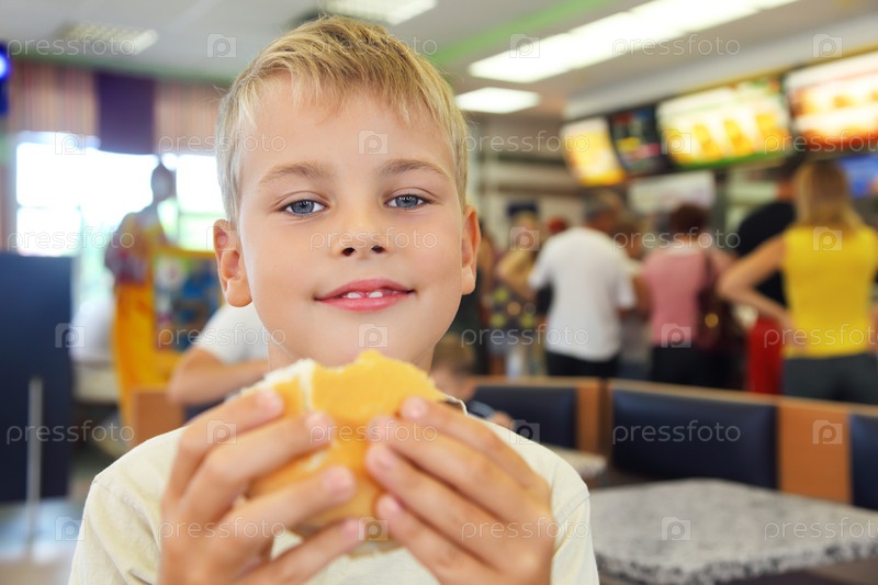 Мальчик ест гамбургер