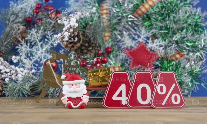 Большие продажи 40%, сорок процентов с рождественским венком на фоне старой доски сарая, вид спереди, пространство для копирования. Рождественская большая распродажа