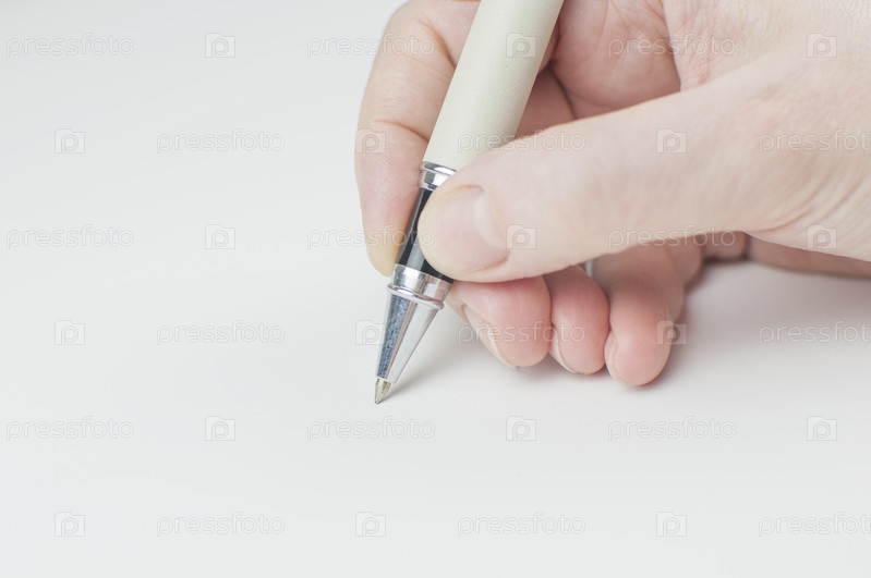 Молодая женщина держит ручку на белом фоне, крупным планом