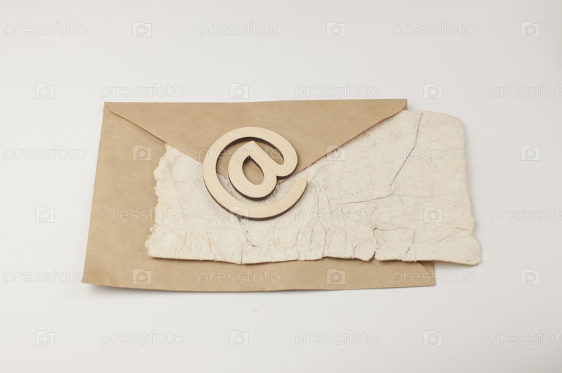 Знак электронной почты на коричневом конверте с чистым листом старой бумаги лежит на белом фоне. Концептуальное письмо по электронной почте