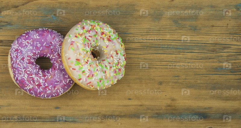 Глазированные пончики на деревянном фоне