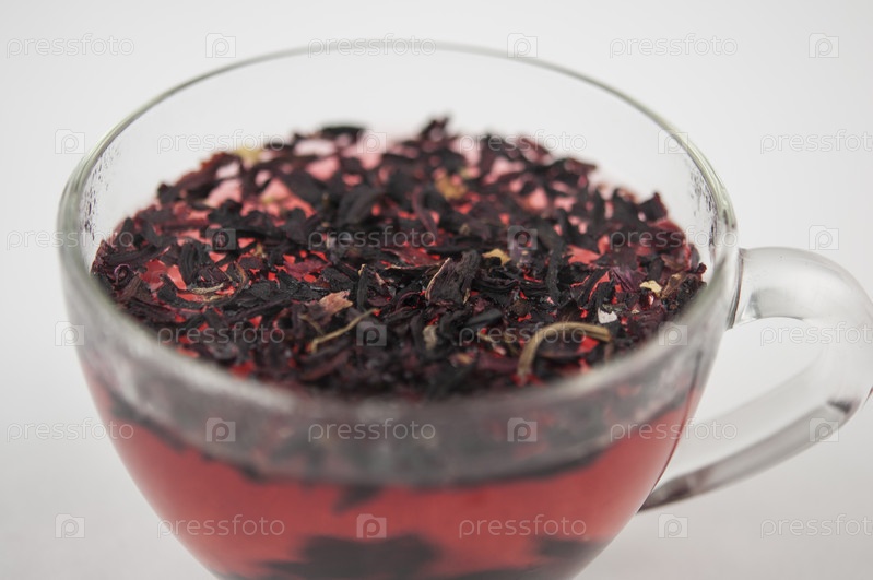 Каркаде. Чайный напиток в стакане. Красная жидкость в стакане. Засохшие лепестки. Гибискус. Суданская роза
