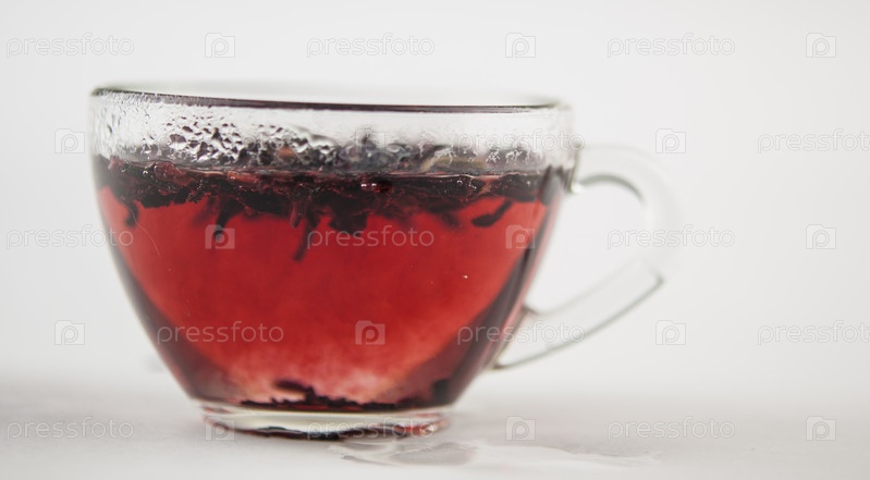 Каркаде. Чайный напиток в стакане. Красная жидкость в стакане. Засохшие лепестки. Гибискус. Суданская роза