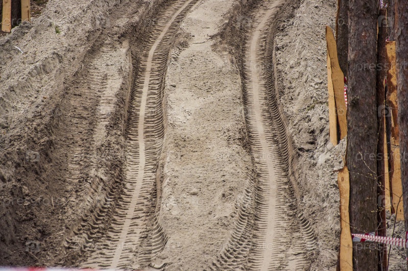 Следы и следы протектора проселочной песчаной лесной дороги летом. Внедорожный фон