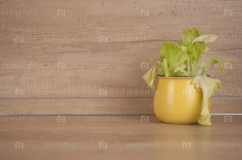 Листья салата в желтой кастрюле на столе