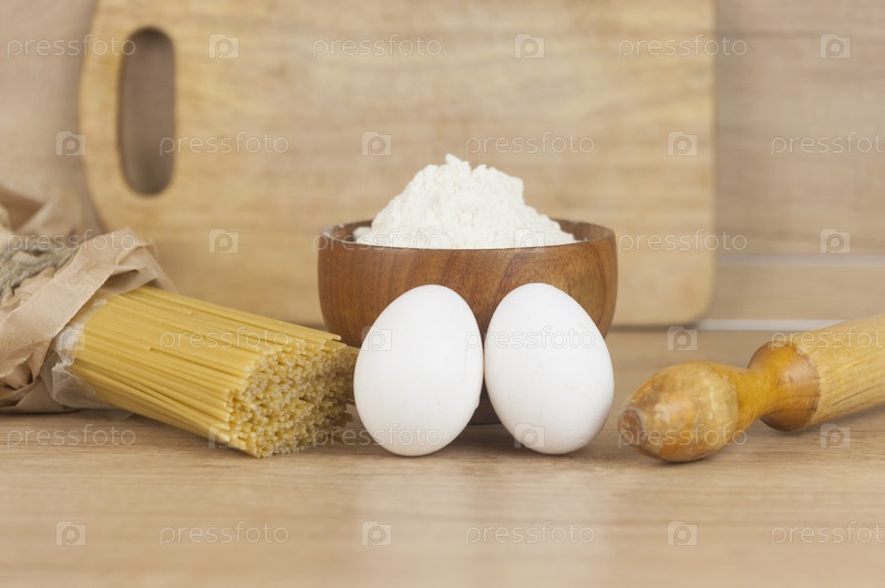 Тесто для спагетти с яйцами, мукой и скалкой на деревянном столе