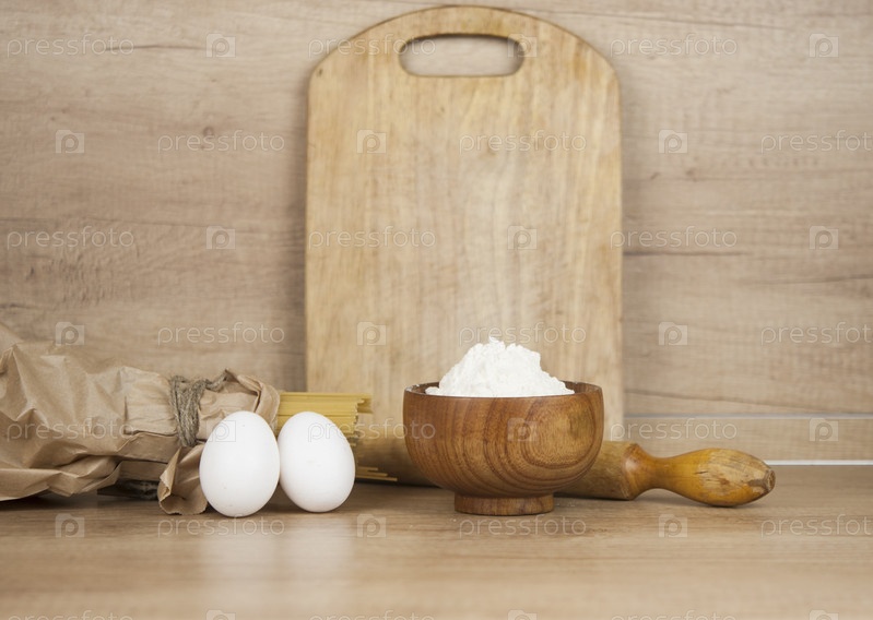 Тесто для спагетти с яйцами, мукой и скалкой на деревянном столе