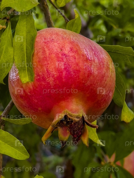 Красный спелый плод граната висит на ветке и созревает
