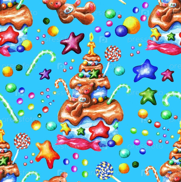 Праздничный детский торт. Бесшовный акварельный узор (8)