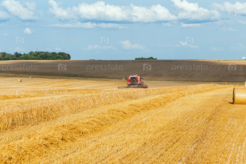 Зерноуборочный комбайн собирает спелую пшеницу в солнечный летний день