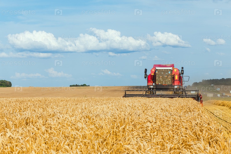 Зерноуборочный комбайн собирает спелую пшеницу в солнечный летний день