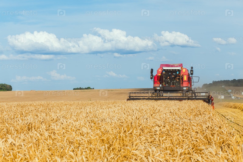 Зерноуборочный комбайн собирает спелую пшеницу в солнечный летний день