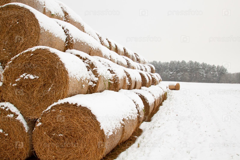 Соломенные кормовые тюки зимой: солома, оставшаяся после осеннего сбора урожая, используется в качестве корма для животных и подстилки в зимние месяцы