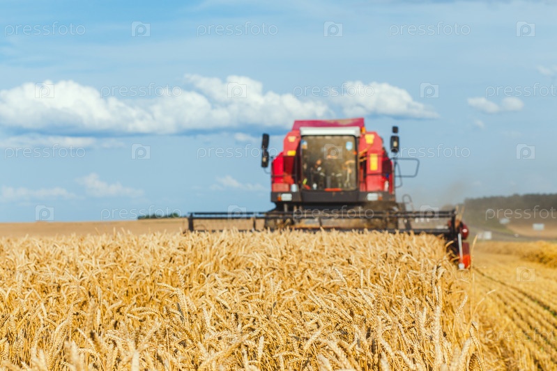 Колосья пшеницы крупным планом на поле и уборочная машина на заднем плане. Комбинировать не в фокусе