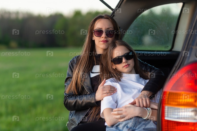 Мать и дочь отдыхают на холме и любуются закатом, сидя в багажнике машины