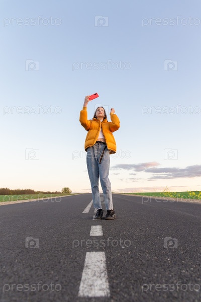 Крутая современная девушка-подросток позирует на одинокой дороге, а фон неба выглядит голубым с облаками на закате