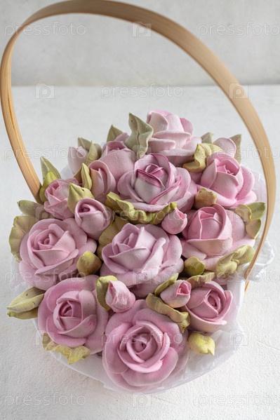 Цветы в пастельных тонах в белой корзине изолированы, флористический свадебный подарок фон, 8 марта, женщины