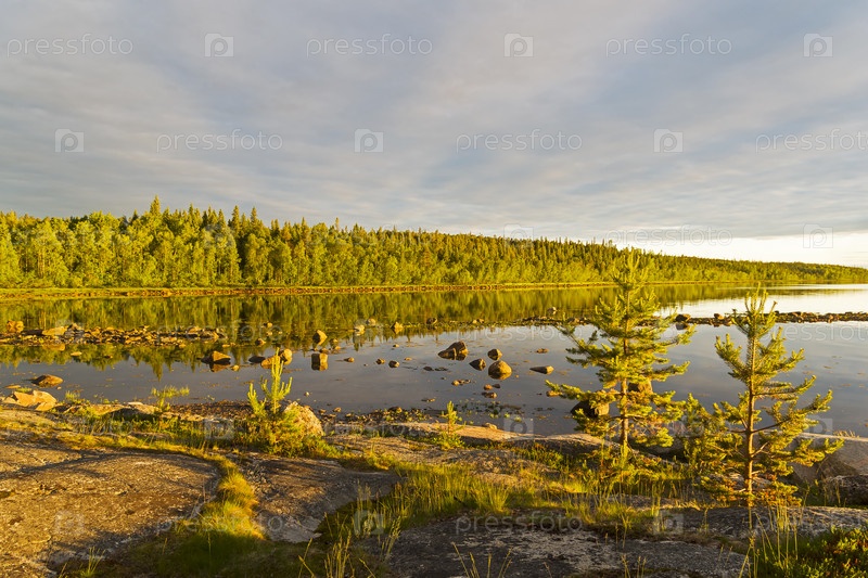 Берег Белого моря в лучах вечернего солнца. Середина прилива. Карелия, Россия, конец июня