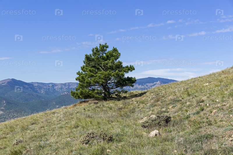 Сосна на горном склоне. Крым, Токлукский хребет, солнечный день в сентябре