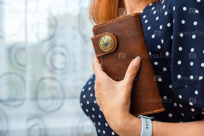 Женщина держит в руке коричневый бумажник из натуральной кожи