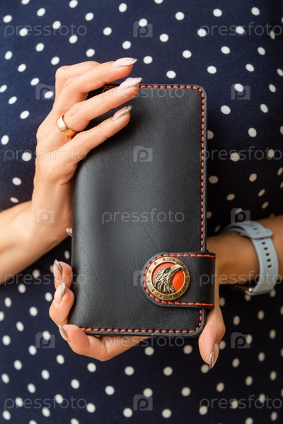 Женщина держит в руках коричневый бумажник из натуральной кожи
