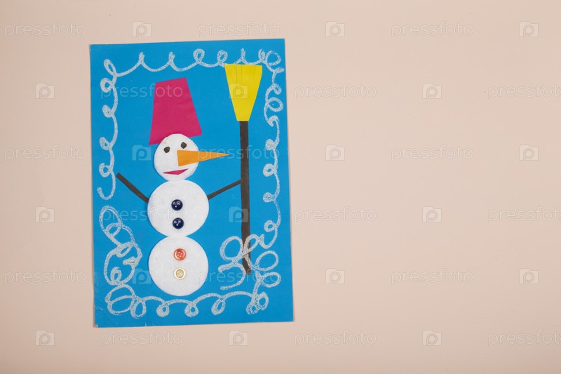Детские новогодние поделки из бумаги. Применение детского творчества. Детский сад и школа ремесел. На бежевом фоне снеговик из цветной бумаги