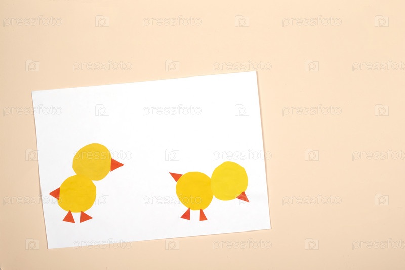 Поделки из бумаги для детей. Применение детского творчества. Детский сад и школа ремесел. На бежевом фоне из цветной бумаги цыплята