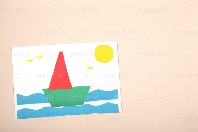 Поделки из бумаги для детей. Применение детского творчества. Детский сад и школа ремесел. На бежевом фоне кораблик из цветной бумаги