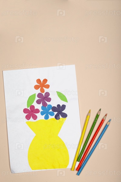 Поделки из бумаги для детей. Применение детского творчества. Детский сад и школа ремесел. На бежевом фоне ваза и цветы из цветной бумаги