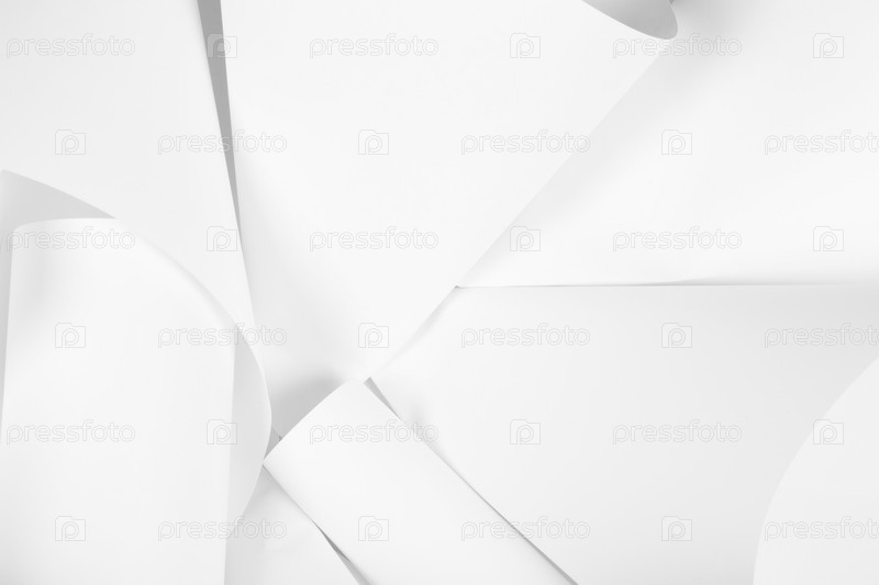 Белые листы офисной бумаги скручены и разбросаны. Бумажный белый абстрактный фон