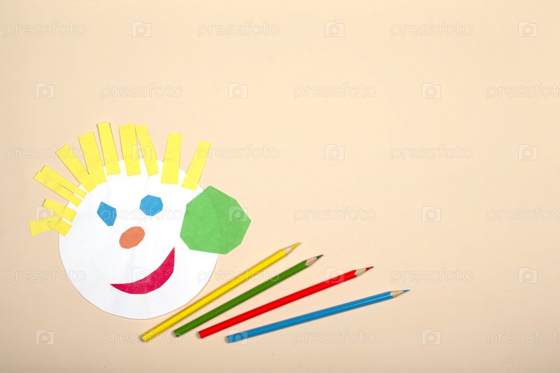 Поделки из бумаги для детей. Применение детского творчества. Детский сад и школа ремесел. На бежевом фоне смешная мордочка человечка из цветной бумаги