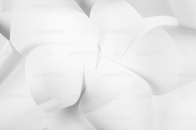 Белые листы офисной бумаги скручены и разбросаны. Бумажный белый абстрактный фон