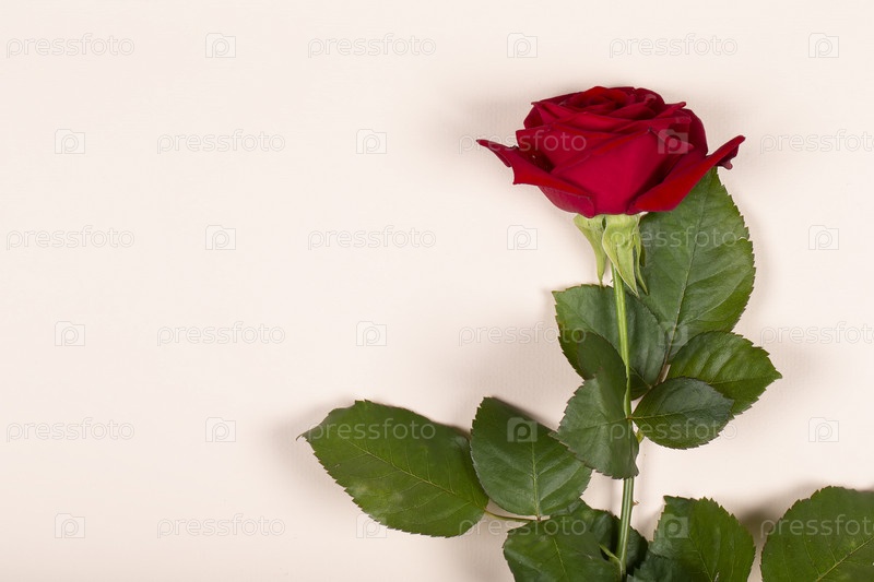 На бежевом фоне красная роза с зелеными листьями. Праздничный цветочный фон