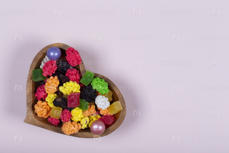 Красочные сладости и конфеты наливают в деревянную вазу в форме сердца