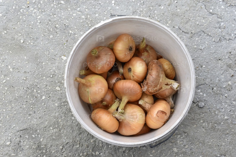Осенью большие луковицы в белом ведре. Красивые и крупные луковицы