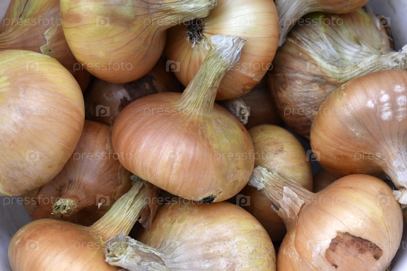 Осенью большие луковицы в белом ведре. Красивые и крупные луковицы