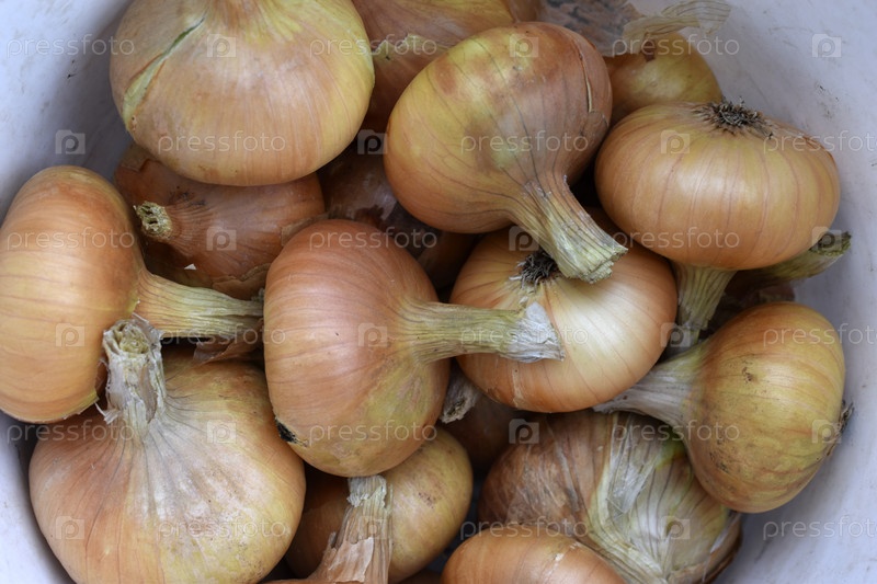 Осенью большие луковицы в белом ведре. Красивые и крупные луковицы