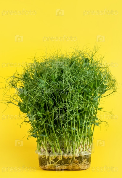 Сочные молодые побеги микро-зеленого гороха крупным планом на желтом фоне. Выращивание семян в домашних условиях. Производство экологически чистого витаминного питания