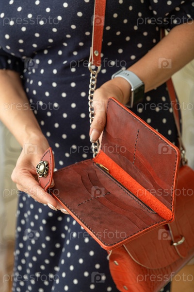 Женщина держит в руках открытый коричневый бумажник из натуральной кожи