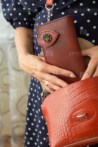 Женщина достает из сумочки коричневый бумажник из натуральной кожи